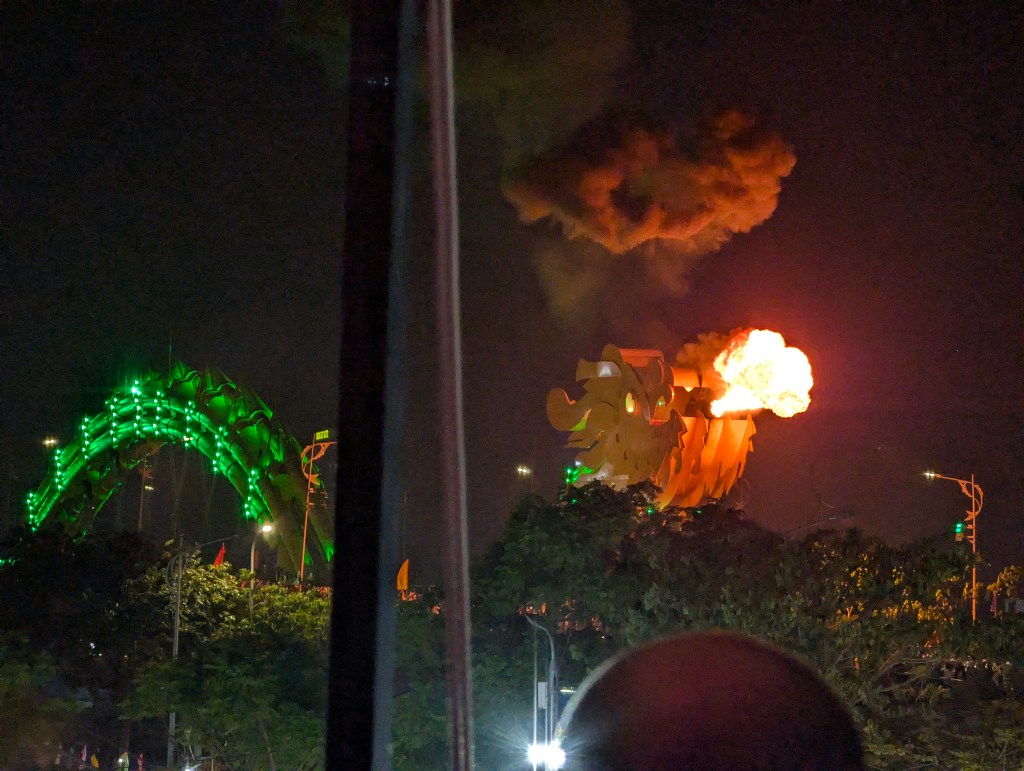 Once the sun set we walked back towards the dragon bridge to find a good position to watch the fire show. On weekends at 9pm the head of the dragon breathes fire. This is one of the must-see attraction in Da Nang. We wandered through the night markets and found a elevated bar with a good view of the bridge. At around 8.30 we had dinner and waited for the fire. When it came it was spectacular, but a little underwhelming. After the fire the dragon head sprayed water. We had been advised to stay away from the water because it’s actually dirty (smelly) river water.