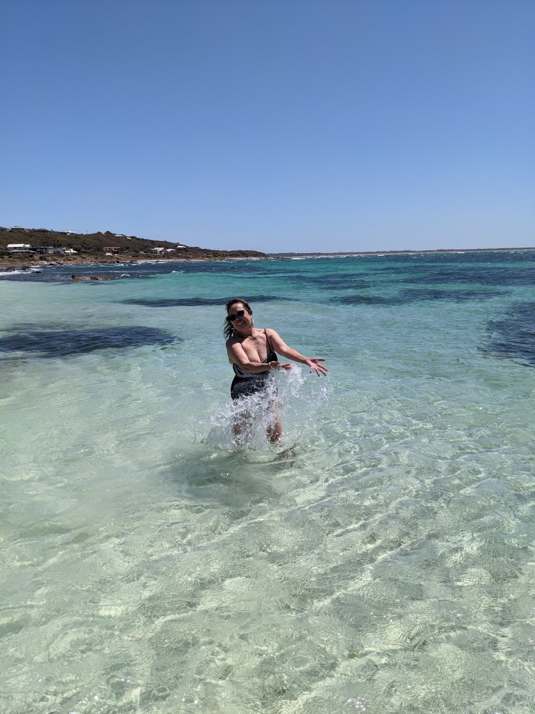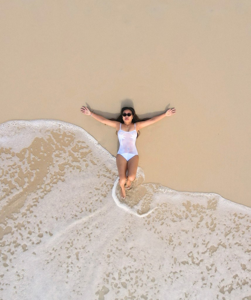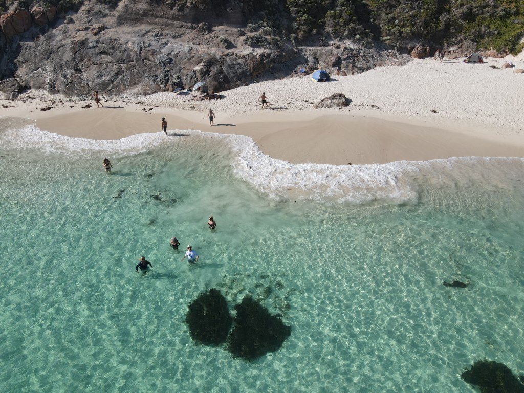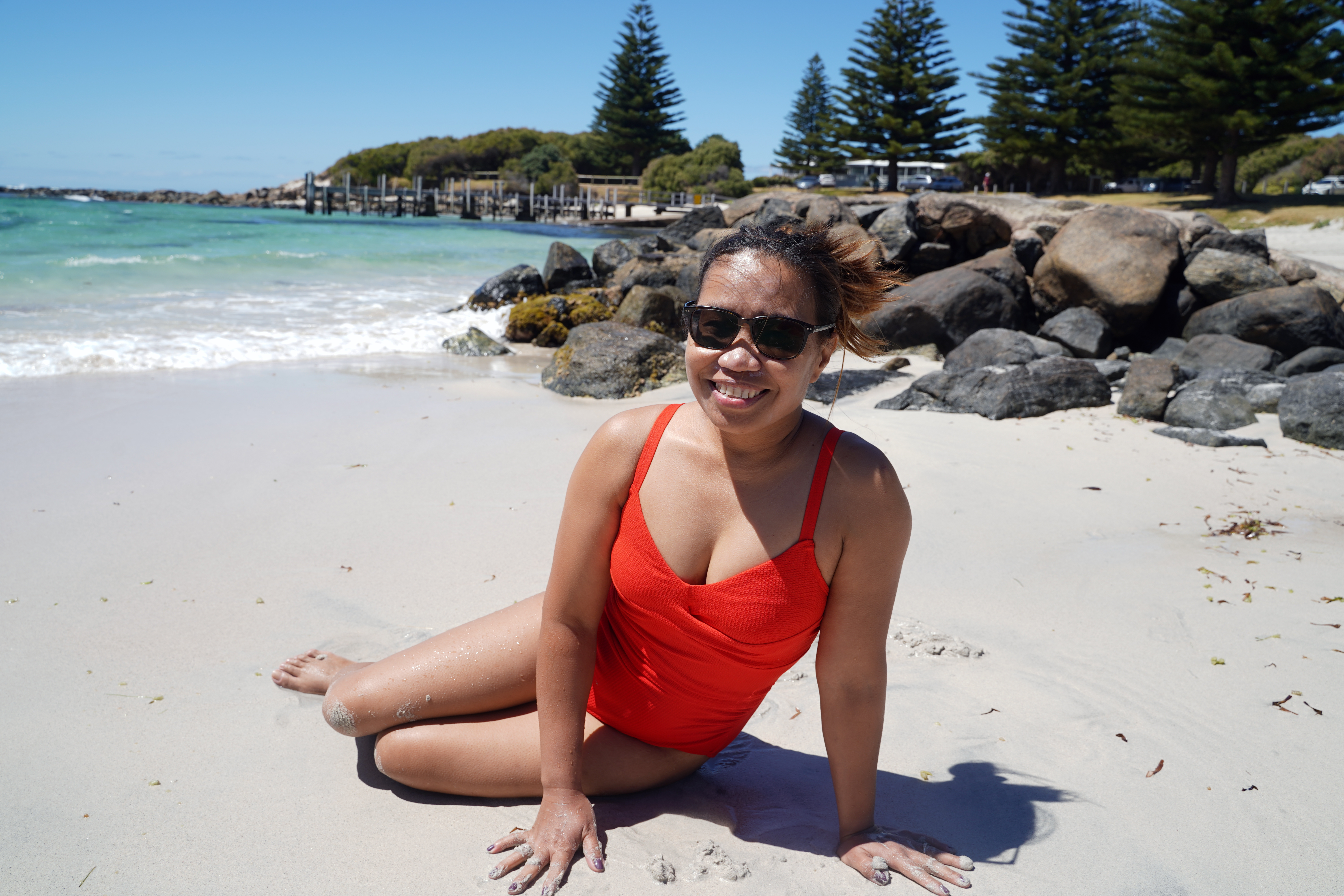 We then travelled to Cosy Corner, a lovely little bay with white sands and crystal clear water. The carpark was full, but surprisingly the beach wasn’t too crowded. We selected a nice spot near the rocks and quickly jumped in the water to cool down. The water was cold, but very refreshing. I flew my drone and tried to get some top-down photos of Jane. Unfortunately they didn’t turn out so well. We all had a great time in the water, until it was time to head home.